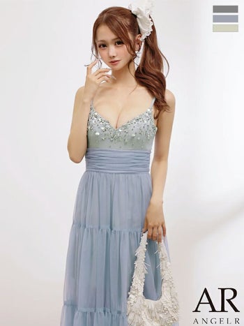 XSあり!メリハリでスタイルアップ◎ 【Angel R/エンジェルアール】 ビジュー ネックパール メッシュ チュールスカート キャミソール Aラインロングドレス (AR25877)