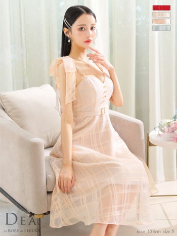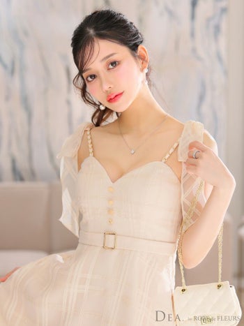 4. 【DEA.by ROBE de FLEURS/ディア】ゴールドチェーン ベルト チェック柄 オーガンジー 肩リボン キャミソール Aラインロングドレス(DE3346)