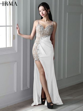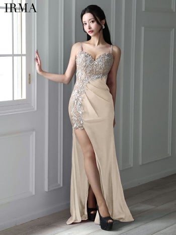 圧倒的な存在感を演出♪ 【IRMA/イルマ】キャミソール ビジュー ハートカット バッククロス スリット タイトロングドレス (41739)