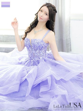 キャバドレス LaLaTulle USA インポート キャミソール フラワー刺繍 シアー チュール レースアップ バースデー オープンバスト Aラインロングドレス