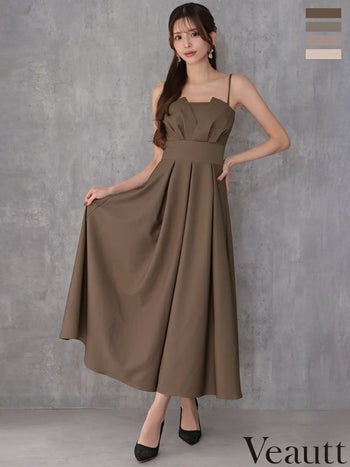 キャバドレス Veautt ヴュート プリーツ 2way ベアトップ ウエストマーク バストタック エレガント ワンカラー キャミソール Aラインロングドレス