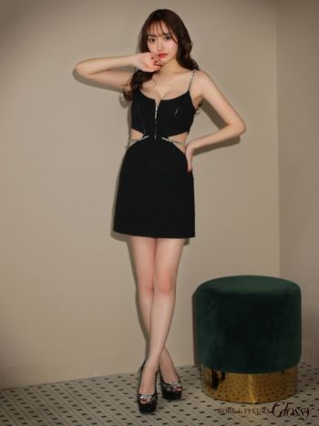3. SALE【Glossy by ROBE de FLEURS/グロッシー】キャミソール フロントジッパー ワッフル生地 ウエストビジュー カット ペチコート付き 台形スカート フレアミニドレス(GL3508)