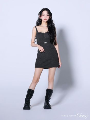 3. 【Glossy by ROBE de FLEURS/グロッシー】キャミソール vカット ワッフル ジップデザイン ウエストベルト タイトミニドレス(GL4136)
