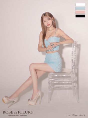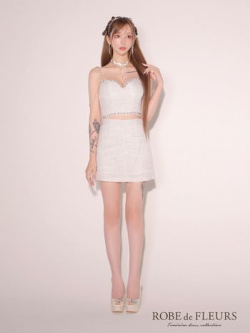 4. 【ROBEdeFLEURS/ローブドフルール】ガーリー オープンバスト キャミソール ビジューチェーン付き ラメ シフォン セットアップ フレアミニドレス (fm3434)