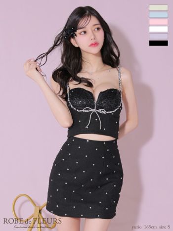 キャバドレス ブランド チュール ジップデザイン ビジュー キャミソール サマーツイード セットアップ フロントリボン ビーズ付き スパンコール フレアミニドレス