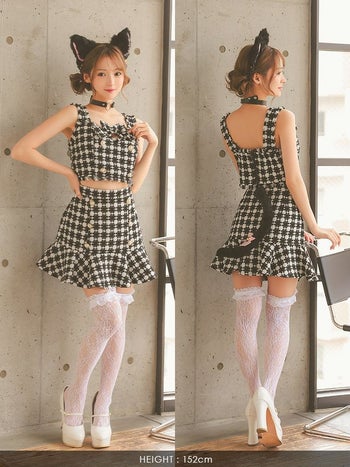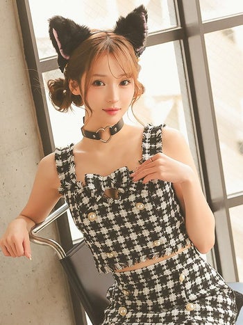 3. SALE【コスプレ】千鳥格子柄 セットアップ ツイード ガーリー パールボタン リボン 猫 アニマル 衣装5点セット[トップス/スカート/カチューシャ/チョーカー/尻尾]