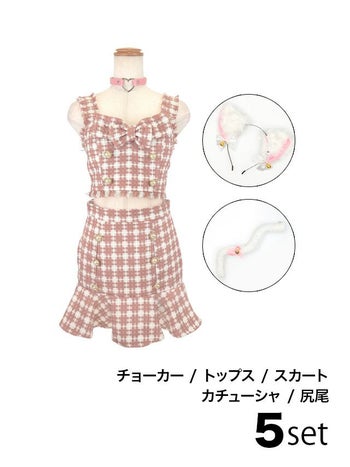 5. SALE【コスプレ】千鳥格子柄 セットアップ ツイード ガーリー パールボタン リボン 猫 アニマル 衣装5点セット[トップス/スカート/カチューシャ/チョーカー/尻尾]