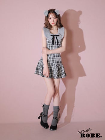 5. 【コスプレ】【ANIER./アニエル】襟付きデザイン チェック柄 ジップデザイン キャミソール オープンバスト ベア アニマル セットアップ フレアミニドレス [ドレス/カチューシャ](anier4044)