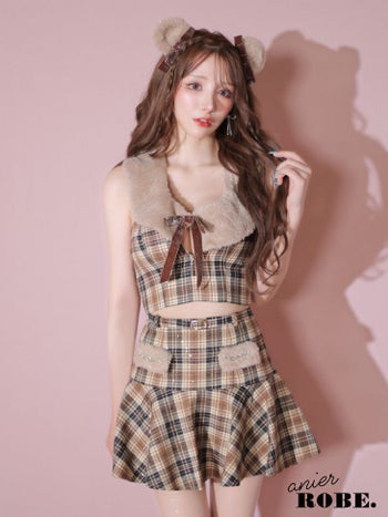 XSあり!ファーパーツは取り外し可能☆ 【コスプレ】【ANIER./アニエル】襟付きデザイン チェック柄 ジップデザイン キャミソール オープンバスト ベア アニマル セットアップ フレアミニドレス [ドレス/カチューシャ](anier4044)