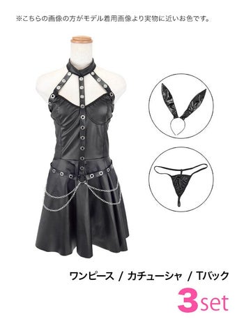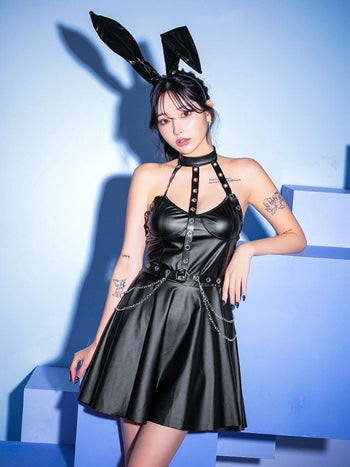 甘辛のバニーデザイン♡ 【コスプレ】フェイクレザー セクシー フレアスカート ハード ハーネス チェーン バニー 衣装3点セット [ワンピース/カチューシャ/Tバック]