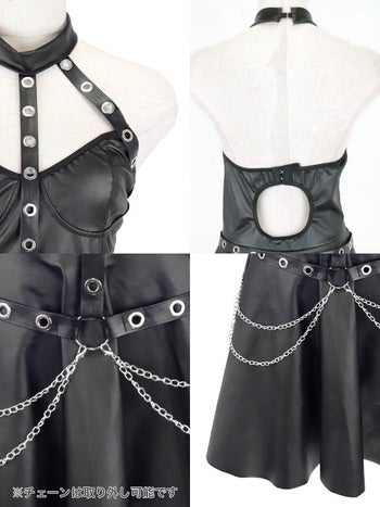 5. 【コスプレ】フェイクレザー セクシー フレアスカート ハード ハーネス チェーン バニー 衣装3点セット [ワンピース/カチューシャ/Tバック]
