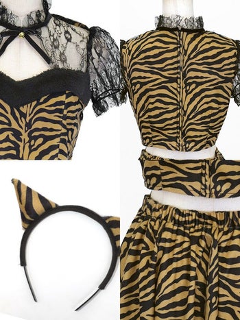 派手カワな一着♡ 【コスプレ】鬼 バストカット へそ出し ブラックレース フレアスカート ガーリー アニマル 衣装3点セット[トップス/スカート/カチューシャ]
