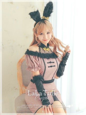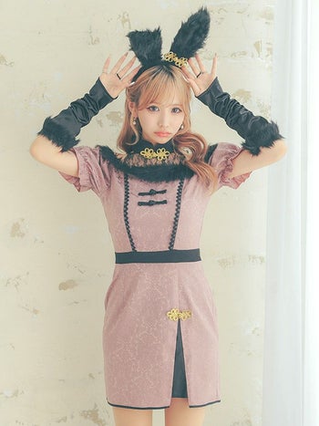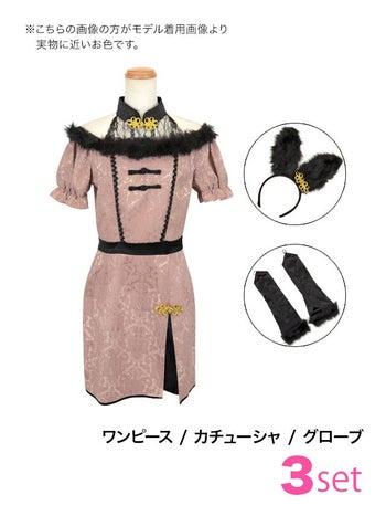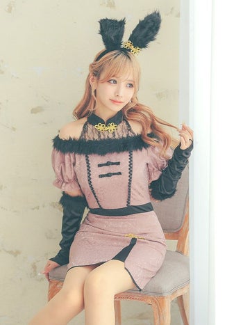 くすみカラーがレトロ可愛い♡ 【コスプレ】レトロ ブラックフェザー 肩出し ガーリー チャイナ バニー アニマル 衣装3点セット [ワンピース/カチューシャ/グローブ]