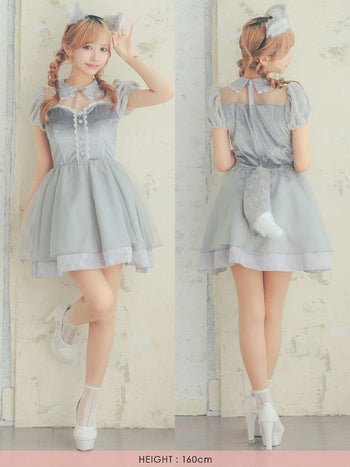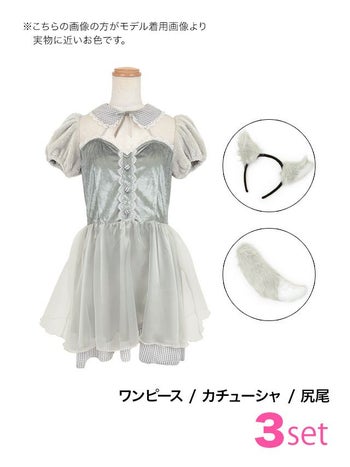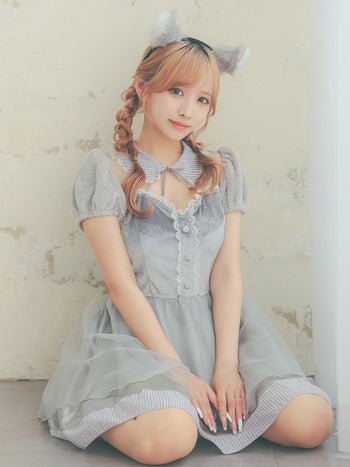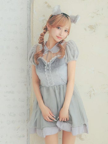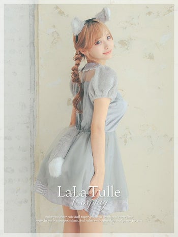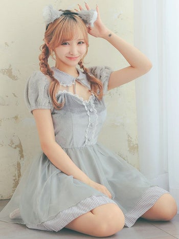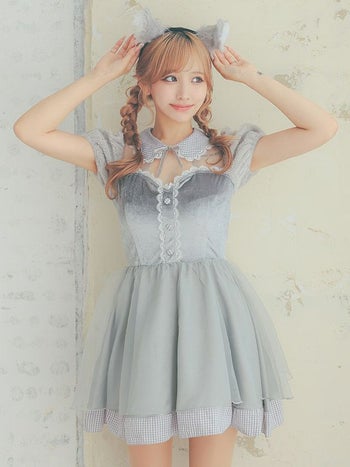 ふんわりあざと可愛い♡ 【コスプレ】ベロア ギンガムチェック柄 シフォン ガーリー ウルフ アニマル 衣装3点セット [カチューシャ/ワンピース/しっぽ]