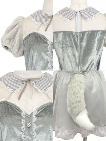 4. 【コスプレ】ベロア ギンガムチェック柄 シフォン ガーリー ウルフ アニマル 衣装3点セット [カチューシャ/ワンピース/しっぽ]