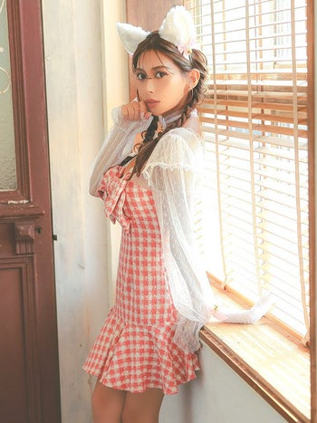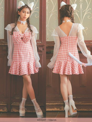 5. 【コスプレ】バストリボン 長袖 ツイード チェック柄 フリル ガーリー 猫 アニマル 衣装4点セット [ワンピース/チョーカー/カチューシャ/尻尾]