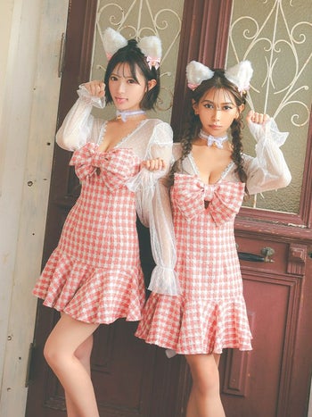 可愛いを詰め込んだデザイン♡ 【コスプレ】バストリボン 長袖 ツイード チェック柄 フリル ガーリー 猫 アニマル 衣装4点セット [ワンピース/チョーカー/カチューシャ/尻尾]