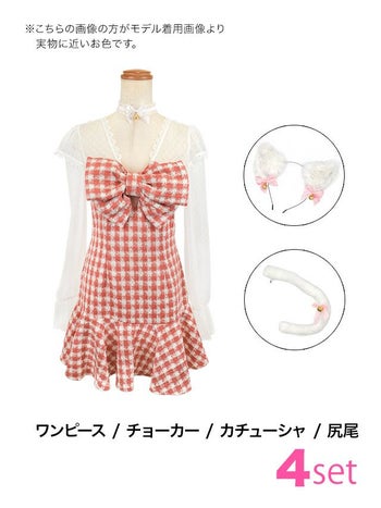 4. 【コスプレ】バストリボン 長袖 ツイード チェック柄 フリル ガーリー 猫 アニマル 衣装4点セット [ワンピース/チョーカー/カチューシャ/尻尾]