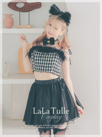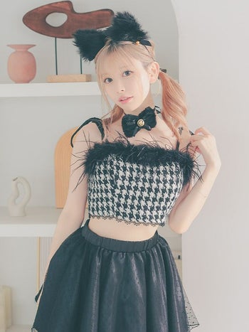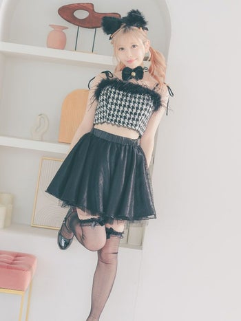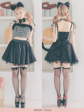 4. 【コスプレ】千鳥格子 ツイード セットアップ へそ出し ふわふわ 猫 アニマル 衣装4点セット[トップス/スカート/チョーカー/カチューシャ]