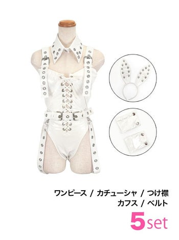 5. SALE【コスプレ】レザー ハード セクシー アイレット インポート バニー 衣装5点セット [ワンピース/カチューシャ/付け襟/カフス/ベルト]