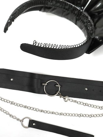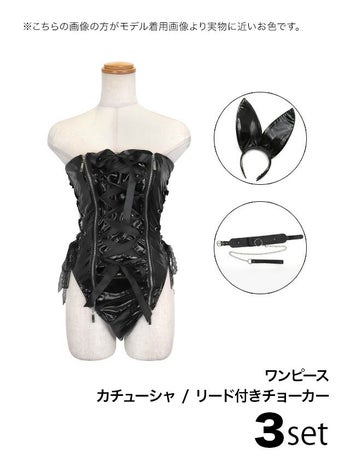 3. SALE【コスプレ】バニー ハイレグ エナメルレザー レースアップリボン セクシー ジップ ハード 衣装3点セット[ワンピース/カチューシャ/リード付きチョーカー]