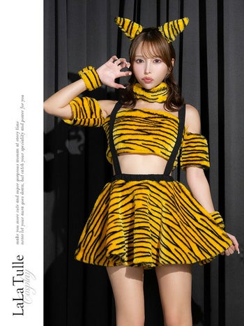 4. SALE【コスプレ】鬼 トラ柄 サスペンダー へそ出し ベアトップ フレアスカート アニマル 衣装6点セット [トップス/スカート/角/チョーカー/カフス/レッグカバー]