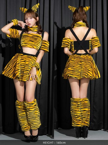 5. SALE【コスプレ】鬼 トラ柄 サスペンダー へそ出し ベアトップ フレアスカート アニマル 衣装6点セット [トップス/スカート/角/チョーカー/カフス/レッグカバー]