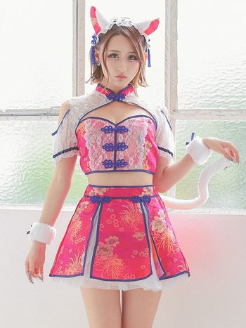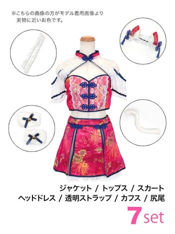 5. SALE【コスプレ】チャイナ セットアップ ガーリー フレアスカート へそ出し 猫 アニマル 衣装7点セット [ジャケット/トップス/スカート/ヘッドドレス/透明ストラップ/カフス/尻尾]
