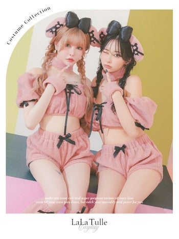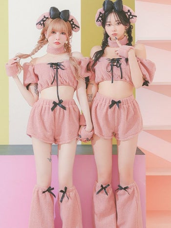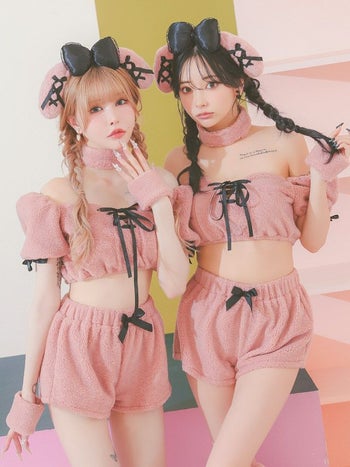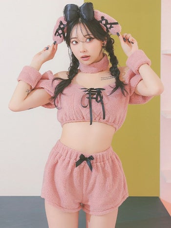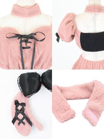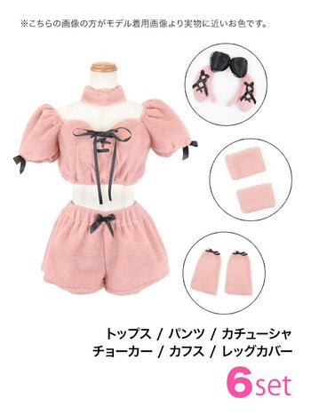 5. SALE【コスプレ】オフショルダー ピンクプードル もこもこ ガーリー リボン 犬 アニマル 衣装6点セット[トップス/パンツ/カチューシャ/チョーカー/カフス/レッグカバー]