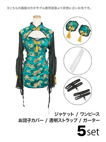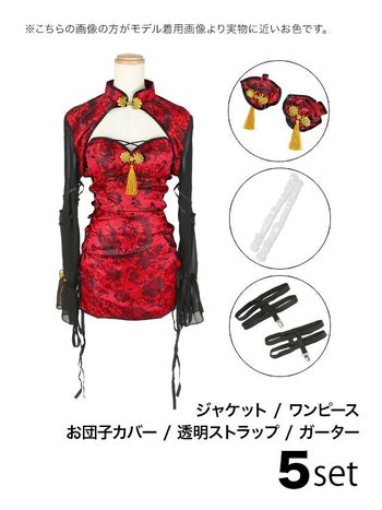 5. SALE【コスプレ】チャイナドレス 谷間 サイドレースアップ セクシー サテン 長袖 衣装5点セット[ジャケット/ワンピース/お団子カバー/ガーター/透明ストラップ]