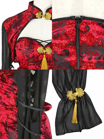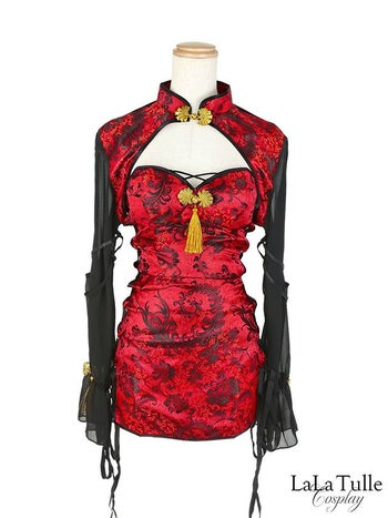 4. SALE【コスプレ】チャイナドレス 谷間 サイドレースアップ セクシー サテン 長袖 衣装5点セット[ジャケット/ワンピース/お団子カバー/ガーター/透明ストラップ]