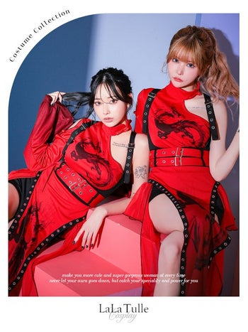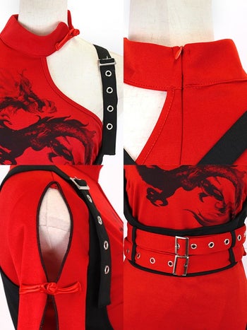 5. SALE【コスプレ】カンフー ロング丈 スリット ドラゴン柄 アシンメトリー デザイン 個性的 チャイナドレス 衣装4点セット[ワンピース/ハーネスベルト/ウエストベルト/パンツ]