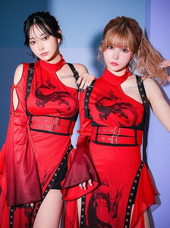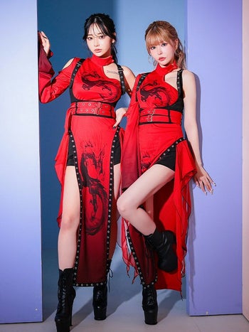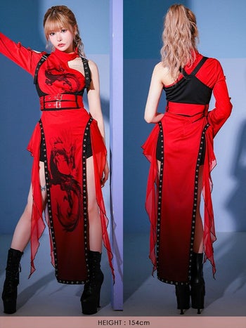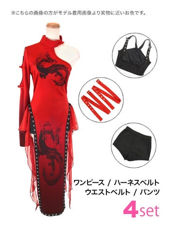 4. SALE【コスプレ】カンフー ロング丈 スリット ドラゴン柄 アシンメトリー デザイン 個性的 チャイナドレス 衣装4点セット[ワンピース/ハーネスベルト/ウエストベルト/パンツ]