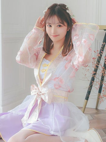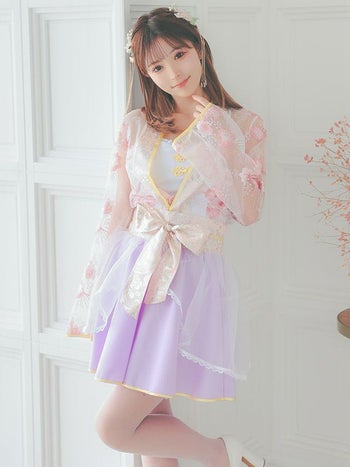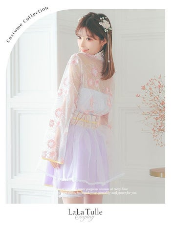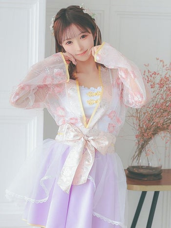 4. 【コスプレ】パステルカラー 長袖 フラワー シースルー フレアスカート 和装束 衣装5点セット [トップス/スカート/着物/ヘアピン/透明ストラップ]