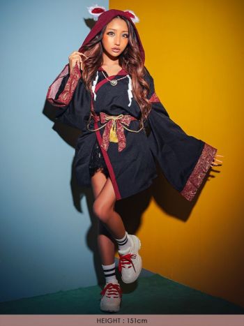 5. 【コスプレ】フード付き 長袖 稲荷様 和装 個性的 ふわふわ 白狐 アニマル 衣装5点セット[ヘアピン/パーカー/首飾り/腰紐/尻尾]