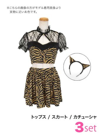 派手カワな一着♡ 【コスプレ】鬼 バストカット へそ出し ブラックレース フレアスカート ガーリー アニマル 衣装3点セット[トップス/スカート/カチューシャ]