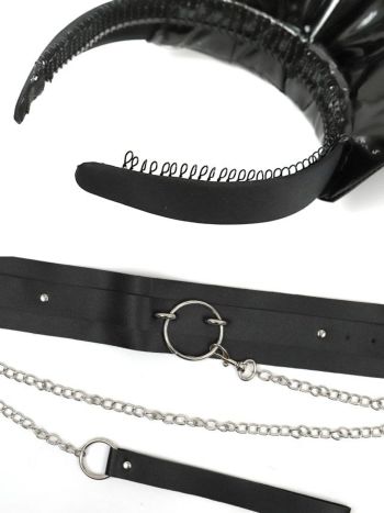 3. 【コスプレ】バニー ハイレグ エナメルレザー レースアップリボン セクシー ジップ ハード 衣装3点セット[ワンピース/カチューシャ/リード付きチョーカー]