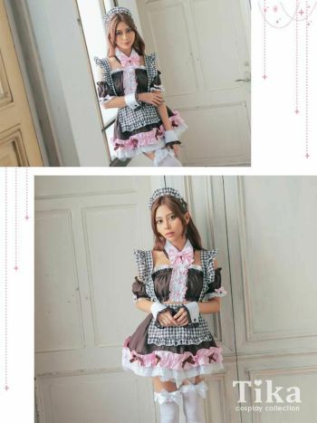 4. 【コスプレ】セクシー ガーリー メイド ギンガム チェック ラブリー フリル リボン フレア スカート へそ出し ペア 衣装8点セット[付け襟/リボンブローチ/ベアトップ/エプロン/スカート/カチューシャ/付け袖/カフス]