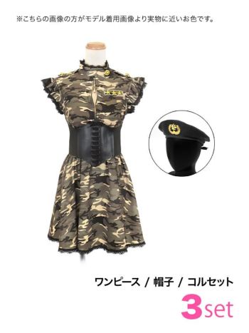 4. SALE【コスプレ】カモフラージュ レース アーミーガール バストジップ コルセット フレアスカート ポリス 衣装3点セット[ワンピース/帽子/コルセット]
