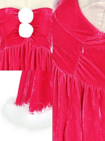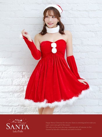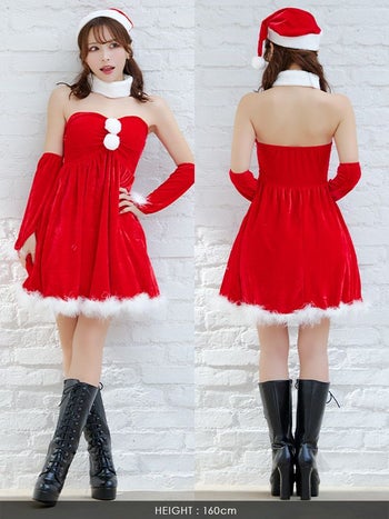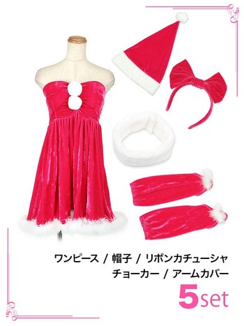 色違いで双子コーデも可愛くておすすめ♪ 【サンタコスプレ】5点セット フェザー付き ベアトップ フレアスカート サンタコスプレ (ワンピース+帽子+リボンカチューシャ+チョーカー+アームカバー)