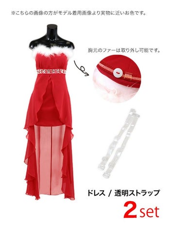 ロングテールデザインでゴージャスな印象に♪ 【サンタコスプレ】2点セット ファー付きベアトップ ロングテール サンタコスプレ(ドレス+透明ストラップ)