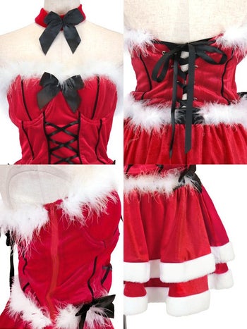 サンタコスプレ 2点セット 猫 ブラックリボン ベロア ベアトップ 2段フレアスカート アニマルサンタコスのスペック表