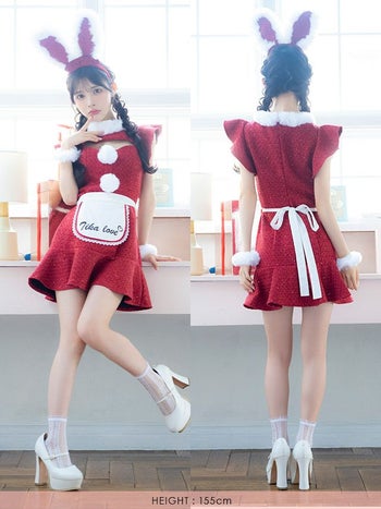 5. 【サンタコスプレ】4点セット ふわふわ ツイード バストカット ガーリー メイド バニー アニマル サンタコスプレ (ワンピース+エプロン+カチューシャ+カフス)