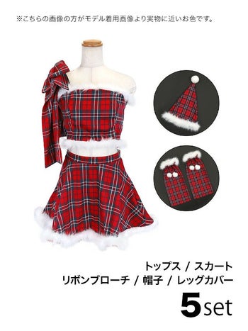 5. 【サンタコスプレ】5点セット チェック ビッグリボン フレアスカート サンタコスプレ (トップス+スカート+リボンブローチ+帽子+レッグカバー)
