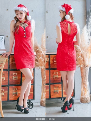 5. 【サンタコスプレ】2点セット チョーカー風リボン 総レース ファー付き サンタコスプレ (ワンピース+サンタ帽子)