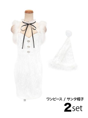 ドレスとしても着れる♪ 【サンタコスプレ】2点セット チョーカー風リボン 総レース ファー付き サンタコスプレ (ワンピース+サンタ帽子)