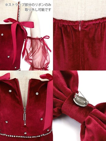 3. 【サンタコスプレ】3点セット 袖あり シアー リボン キラキラ バストジップ 肩あき フレアスカート サンタコスプレ (ワンピース+帽子+リボンブローチ)