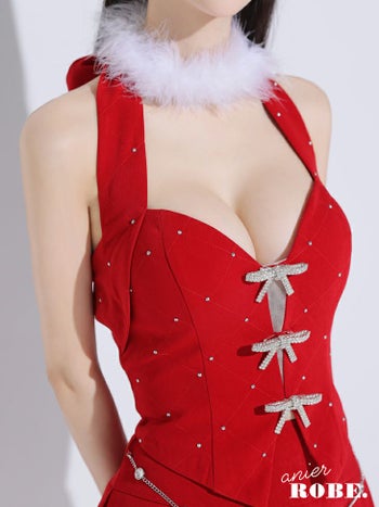 5. 【サンタコスプレ】【ANIER./アニエル】ファーチョーカー リボン スタッズ オープンバスト ノースリーブ ガーリー セットアップ プリーツ フレアスカート サンタコスドレス (anier4046)