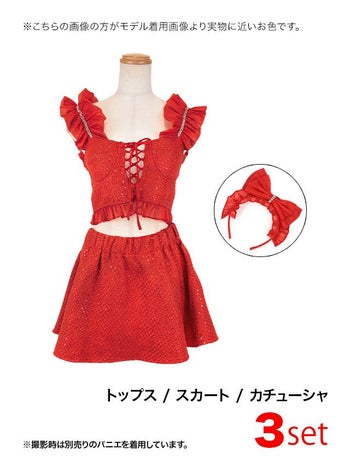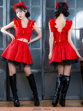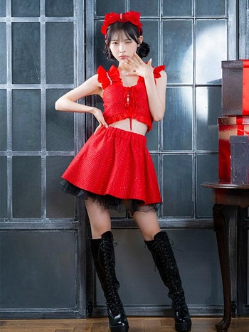 アイドルみたいにcuteなサンタドレス♡ 【サンタコスプレ】3点セット リボン レースアップ ラメ ツイード フリル フレアスカート セットアップ フレアスカート サンタコスプレ (トップス+スカート+カチューシャ)