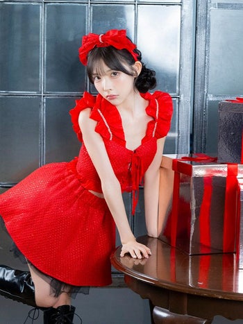 5. 【サンタコスプレ】3点セット リボン レースアップ ラメ ツイード フリル フレアスカート セットアップ フレアスカート サンタコスプレ (トップス+スカート+カチューシャ)